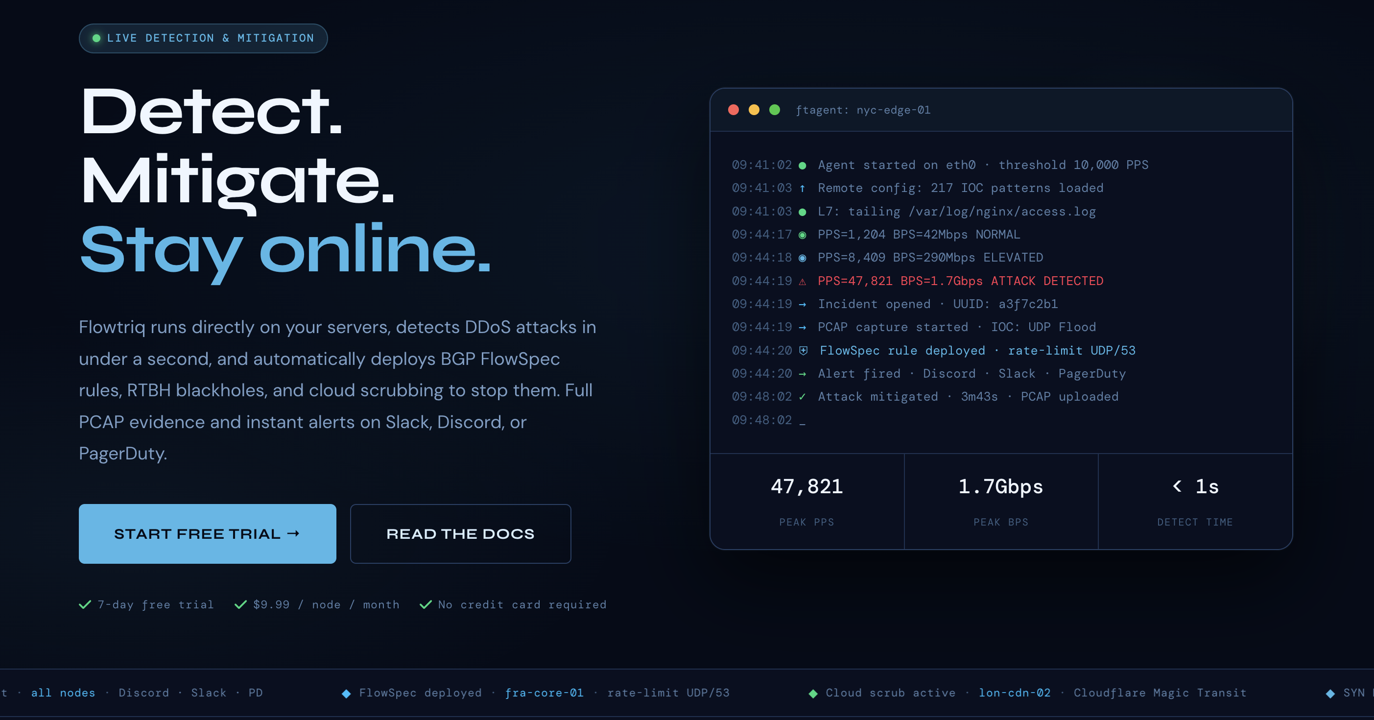 Flowtriq moves away from the "set it and forget it" (and then watch it fail) model of static threshold tuning. The architecture is split between a local, high-performance Python agent and a centralized cloud intelligence dashboard. The ftagent isn't just a passive logger; it’s an active observer reading raw packet data directly from the Network Interface Card (NIC). This design decision is critical: by processing at the edge, Flowtriq avoids the latency inherent in backhauling traffic to a scrubbing center before a threat is even identified.
